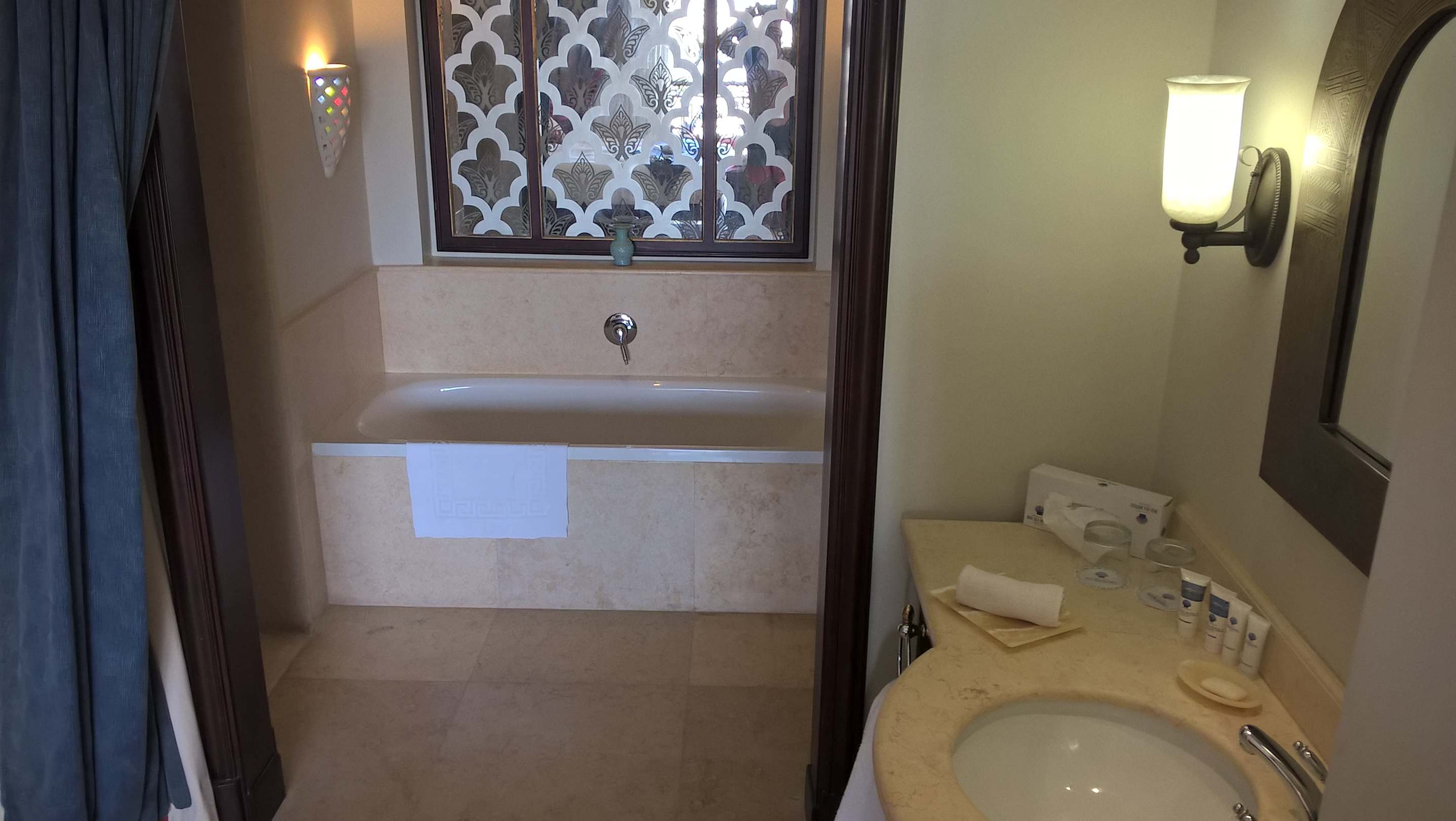 ZimmerBadezimmer, Waschtisch im Zimmer, gerade zu die Badewanne rechts davor die Dusche und links abgehend das WC