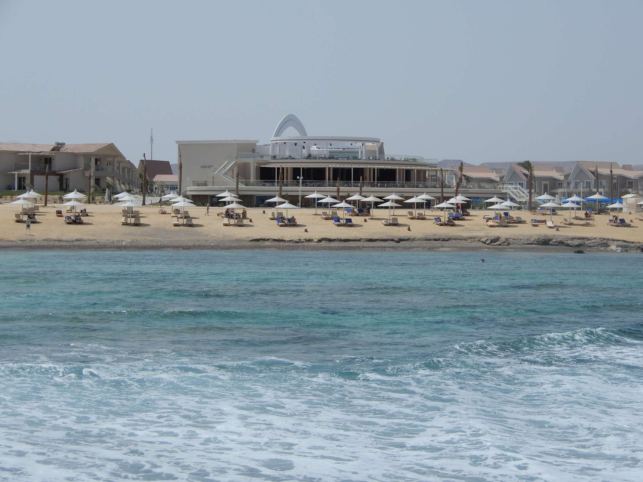 Blick vom Steg auf den Strand mit Red Sky Bar und Food Court-Restaurant