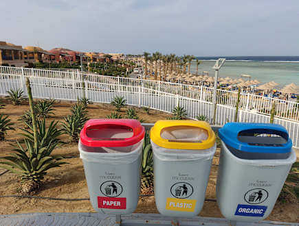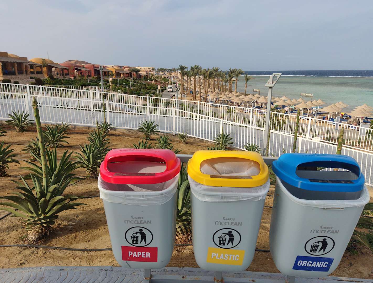 Recylingstationen gibts jede Menge. Dahinter die Rampe zur Strandpromenade.