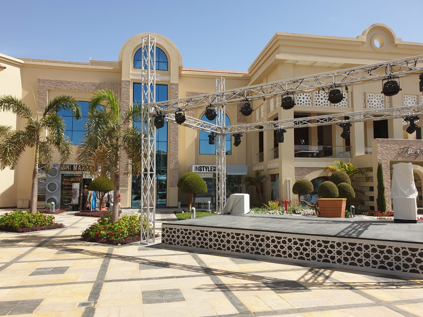 Bühne und im Hintergrund Eingang zum Spa-Bereich