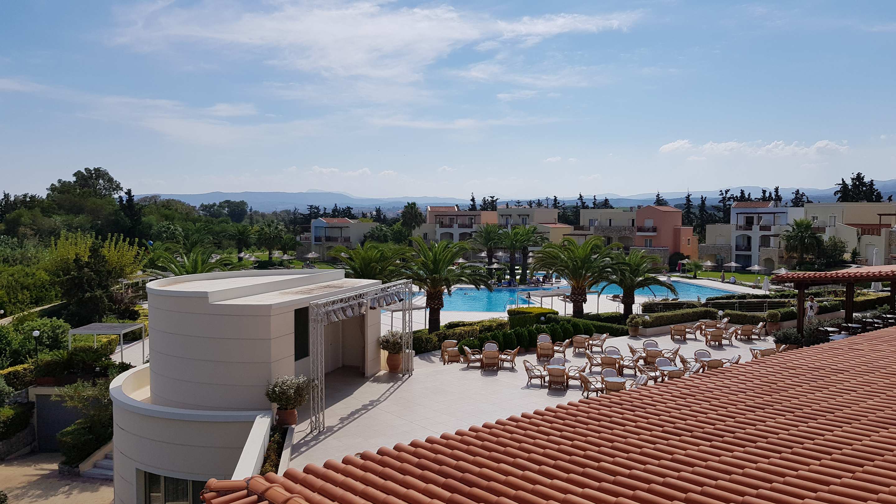Blick von einem der Restaurants auf den Hauptpool, die kleine Bühne und die Poolbar.