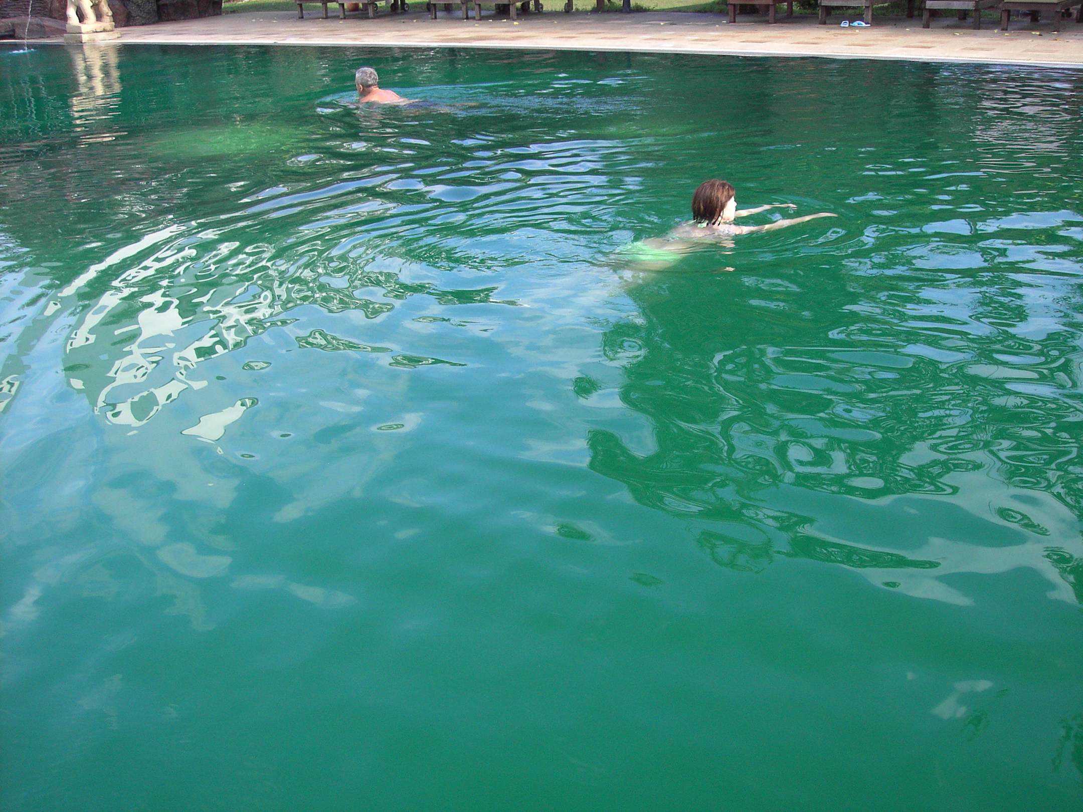 Die Wasserfarbe sagt alles.Im dieser Drecksbrühe lässt man die Leute schwimmen, obwohl gerade Chemikalien hineingepumt ertden.