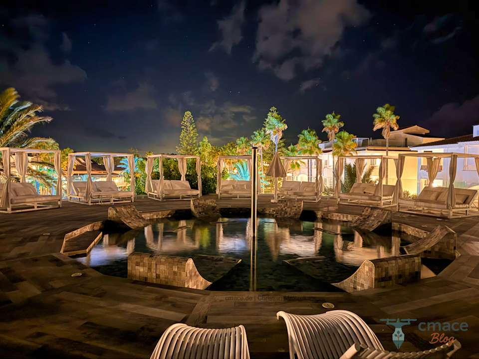 PoolDie exklusive Dachterrasse („Selected Service“) des Hotels strahlt in dezenter Beleuchtung. Bequeme Daybeds umgeben einen dekorativen Wasserbrunnen und bieten Blick in den nächtlichen Himmel – ideal für Ruhesuchende, wenn nicht gerade die Familienbar