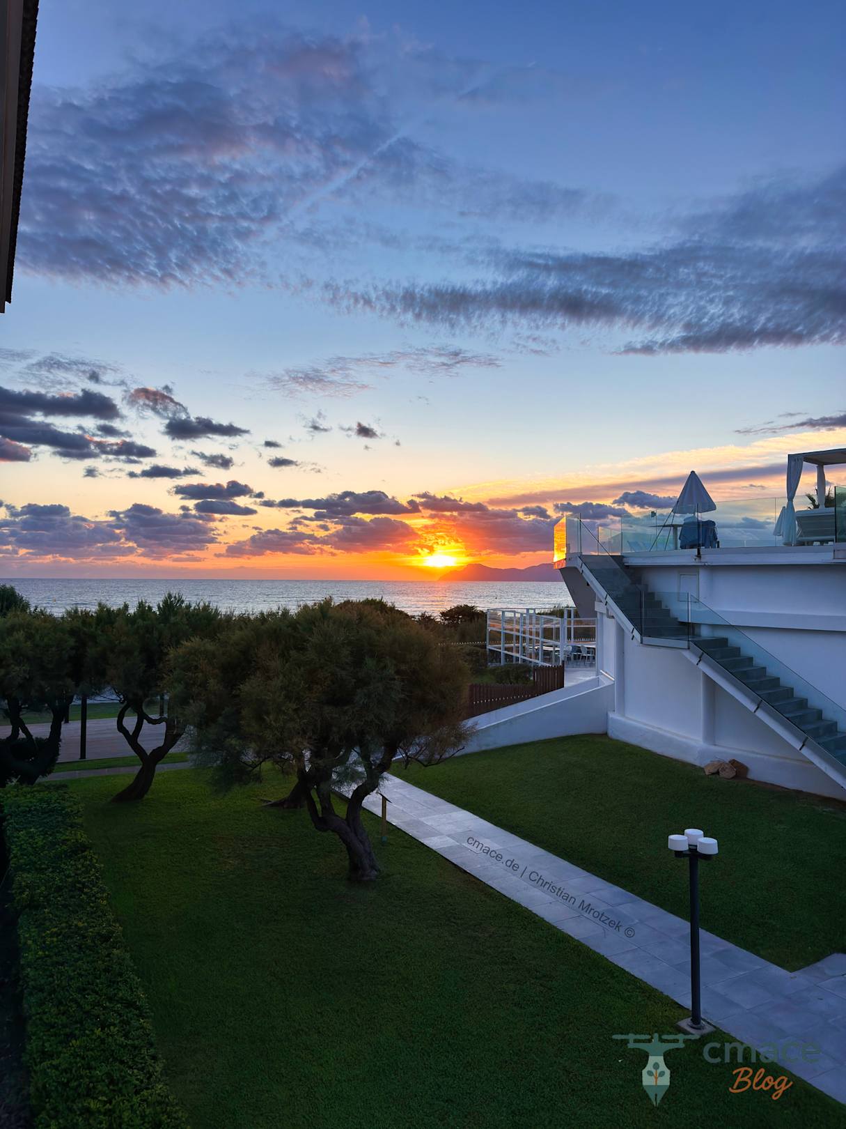 Der traumhafte Blick vom Zimmerbalkon (8103) im frühen Morgenlicht: Die aufgehende Sonne taucht Himmel und Meer in warme Farben. Ein magischer Moment, der zeigt, was ein wirklicher Meerblick ausmacht.