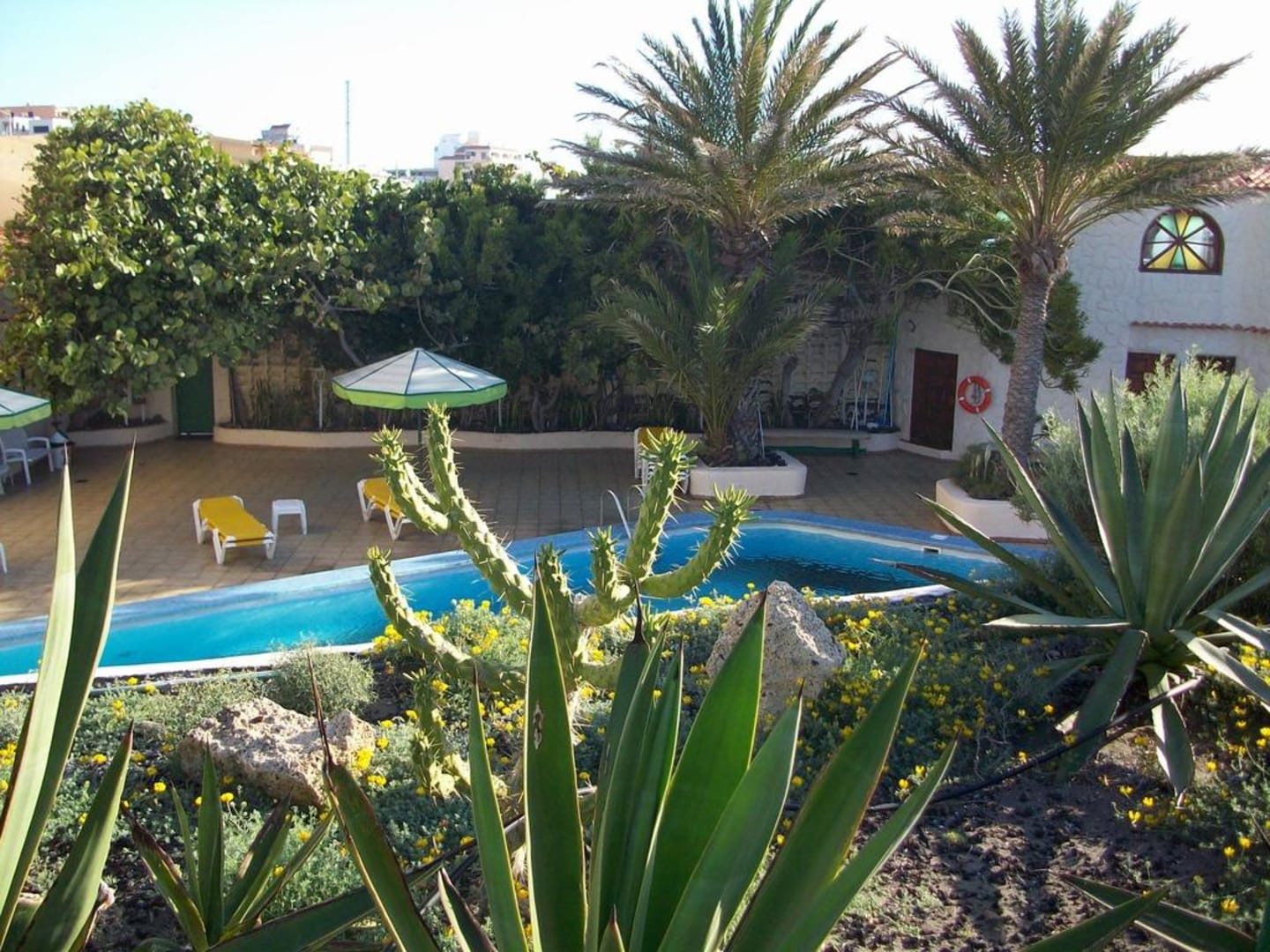 wunderschöner gepflegter garten beim hoteleingang und um den pool