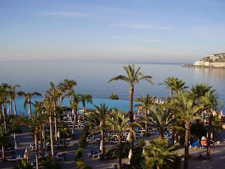 Almunecar, Hotel PlayacalidaBlick von unserem Balkon über den Panoramapool auf das Meer, im Hintergrund die Hochhäuser des Ortsteils Velilla