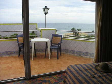 Blick vom bett über Terasse aufs Meer