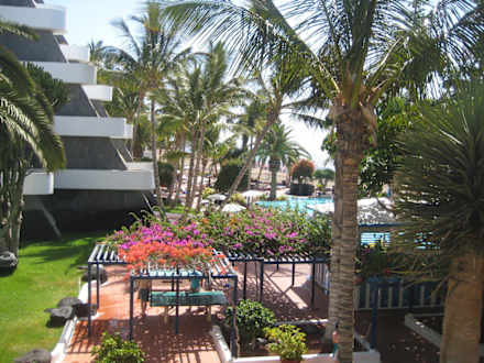 Blick vom Haupthaus zum Poolbereich