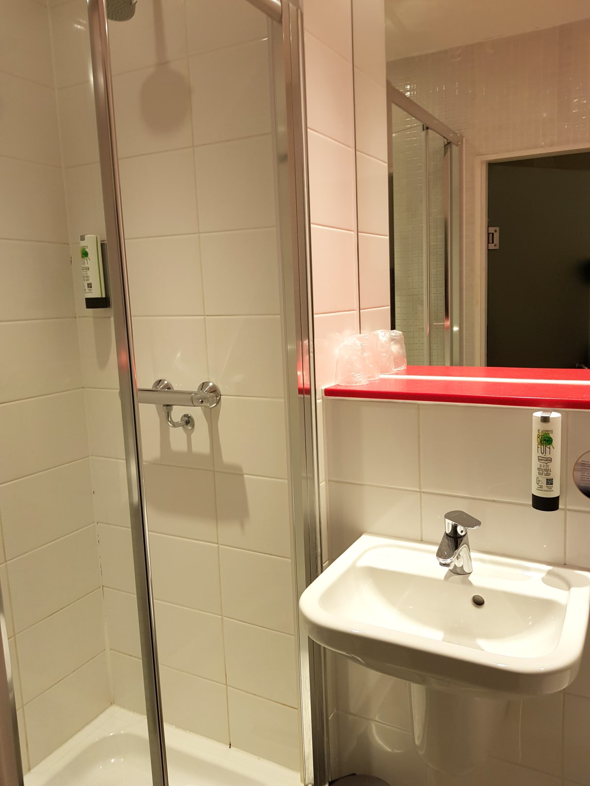 Badezimmer mit Dusche, Waschbecken und WC
