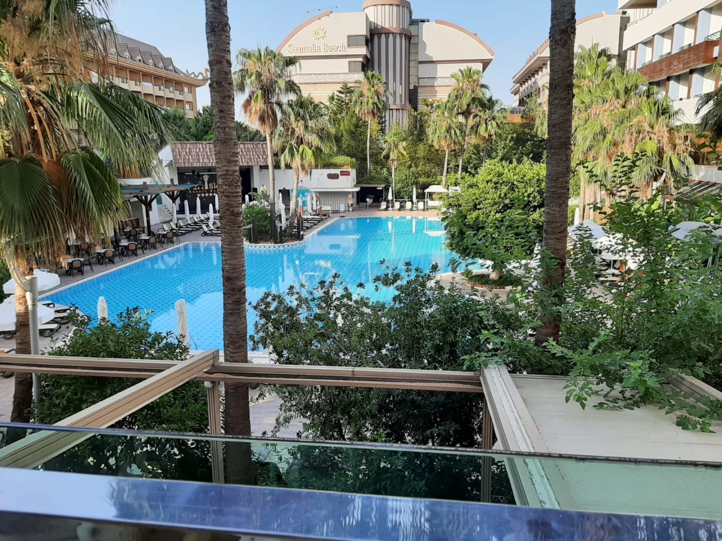 Der Ausblick von der Terrasse auf die Poolanlage