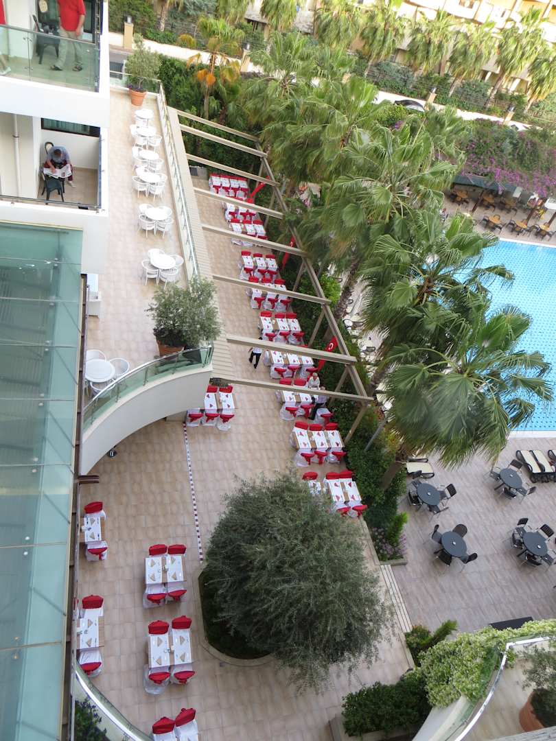 Außenplätze mit eingefahrenen Schiebedach. Wird bei Regen / zuviel Sonne ausgefahren.