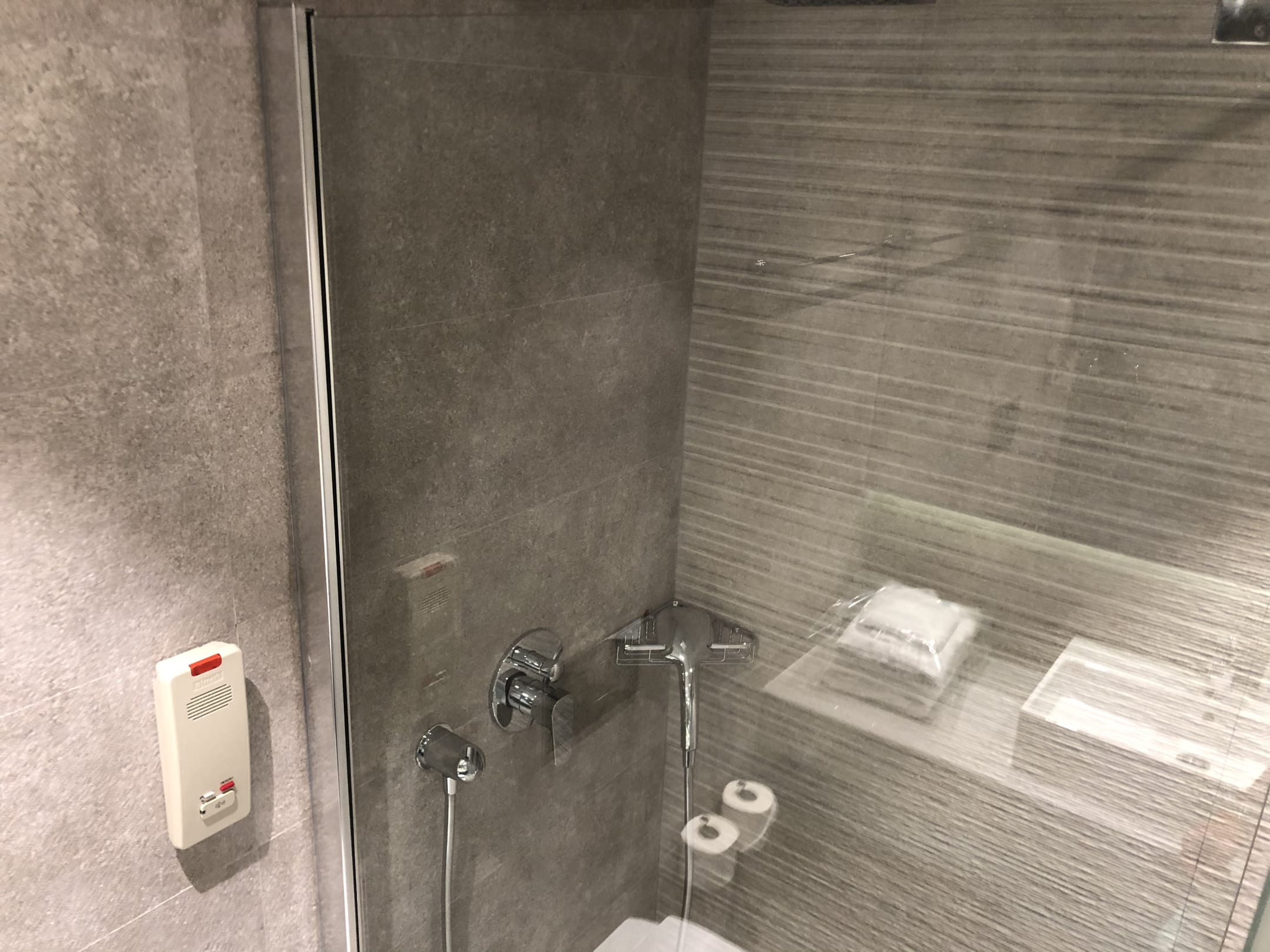 Junior Suite, begehbare Dusche im Bad. Alles in moderner Betonoptik.
