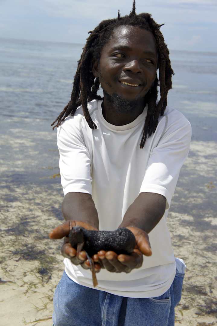 Tubylec z czarną kiełbasą morską