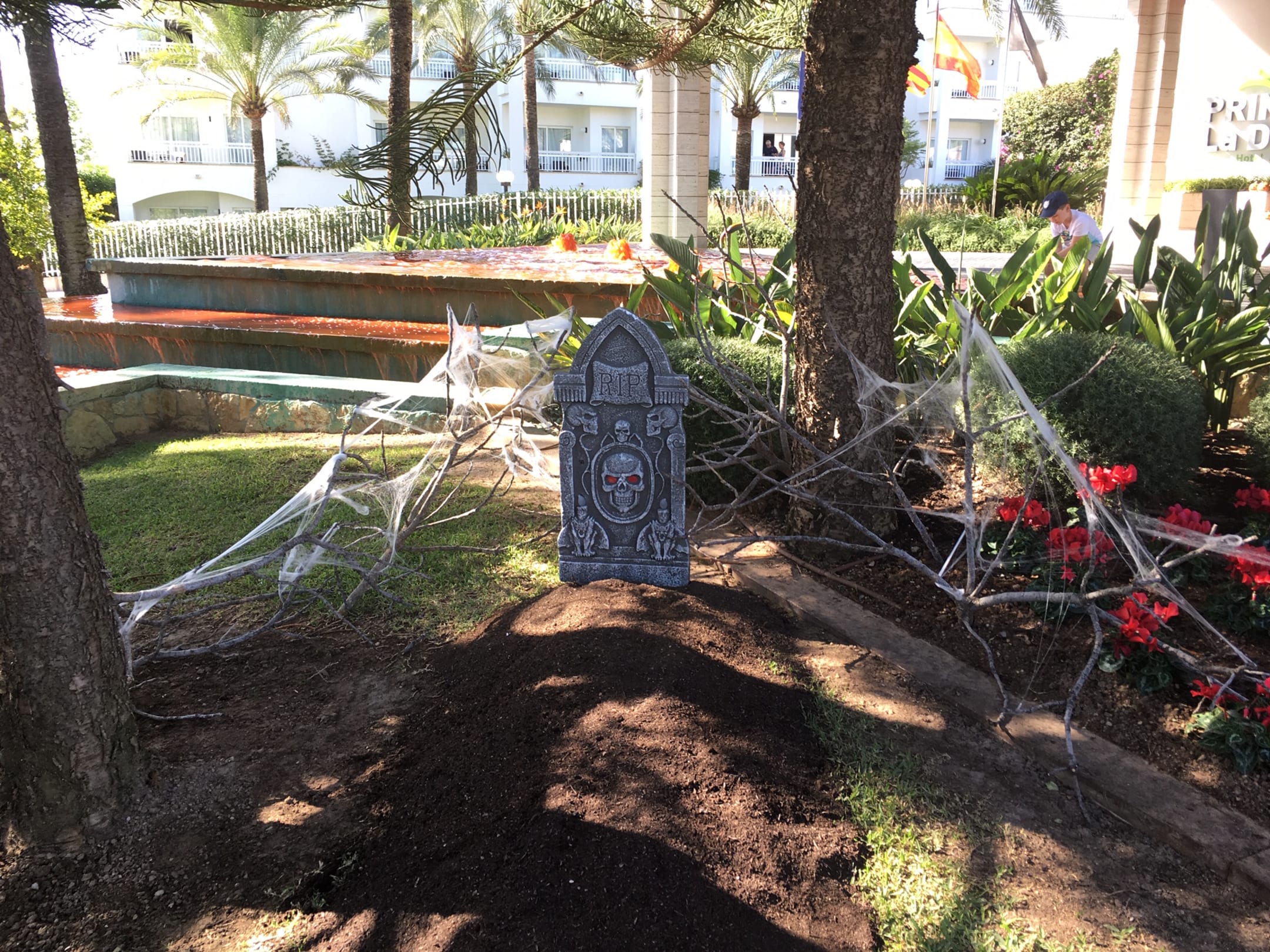 Halloween-Deko: mit Blumenerde aufgeschichtete "Gräber" auf der gesamten Anlage