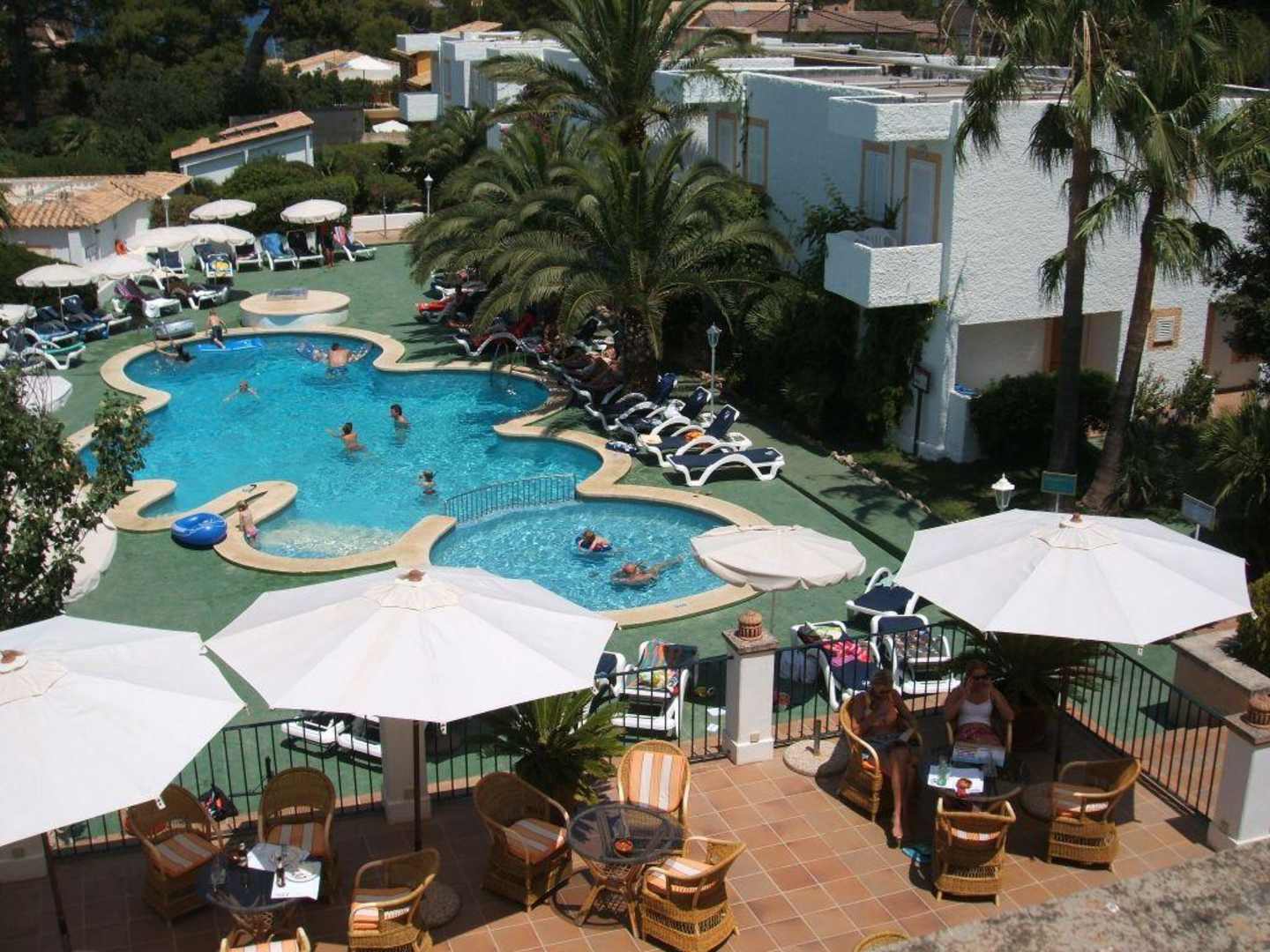 vom Balkon des Haupthauses der Blick auf den Pool/Terasse