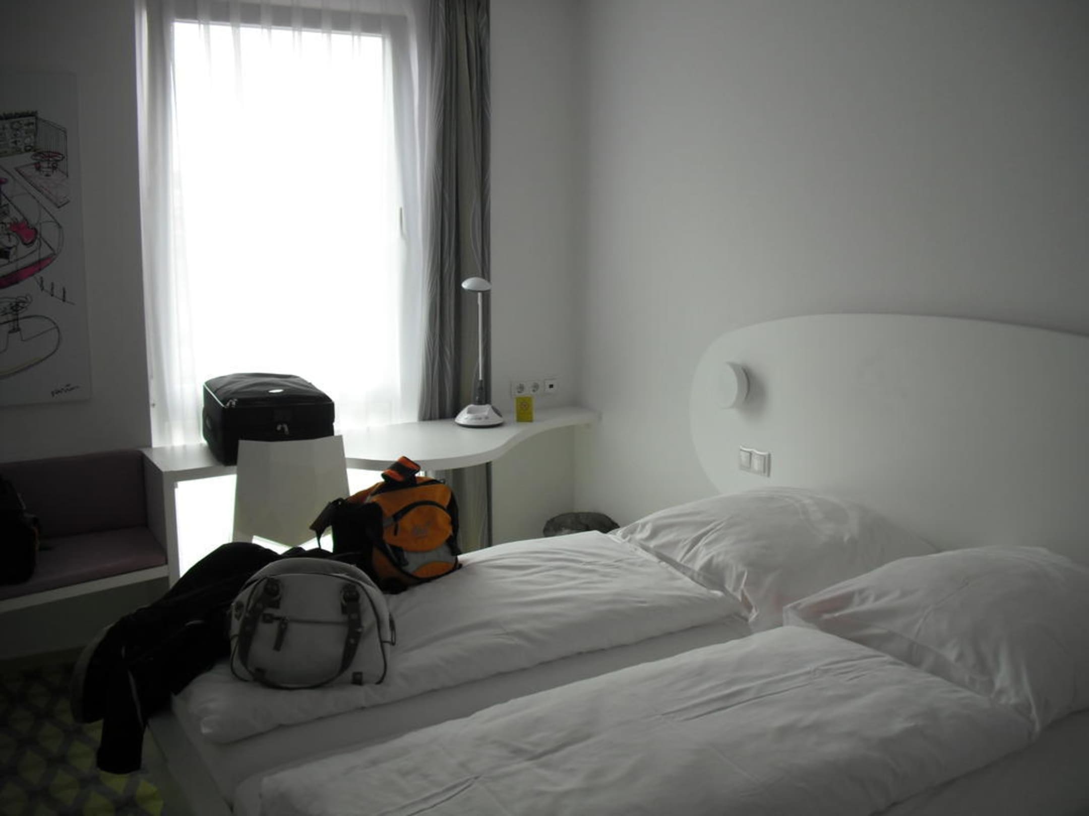 Doppelbett mit integrierten Ablagen, Schreibtisch und Fenster