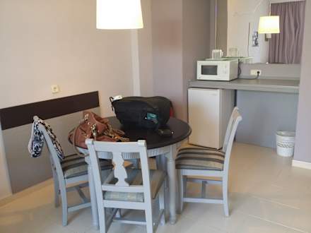 Tisch, Mikrowelle und Kühlschrank