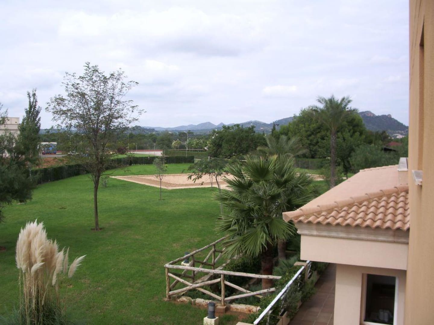 Blick vom Flur hinter das Hotel mit Volleyballplatz.