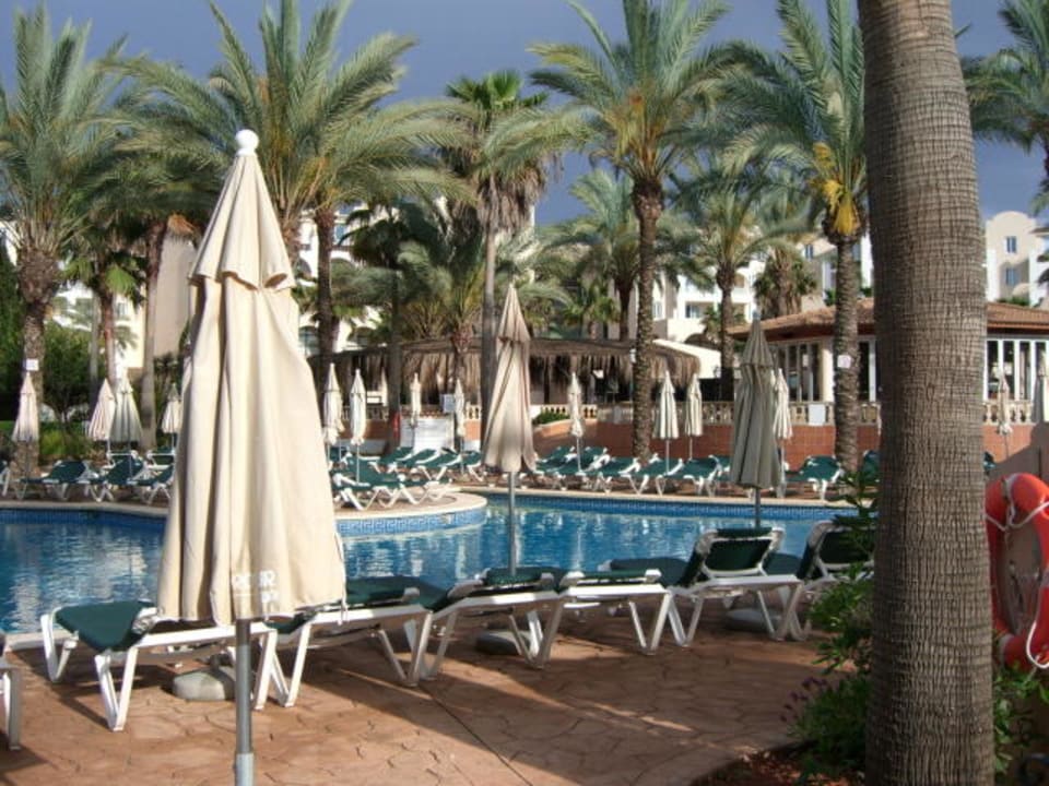 Das Foto zeigt einen Teil der großen Poollandschaft des Hotels. Es gibt zwei Poolbars und reichlich Liegeflächen. Zusätzlich zwei Nichtschwimmer-Becken und einen sehr flachen "Suppenteller" als Kinderbecken vor dem Miniclub.