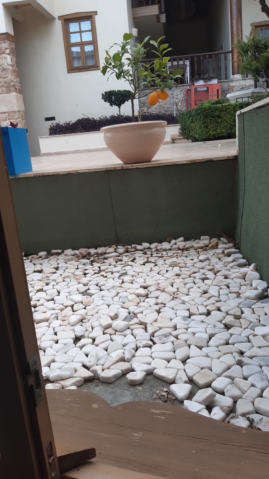 Erstes Zimmer im "Untergeschoß", Blick auf halbhohe Mauer zum Poolbereich....