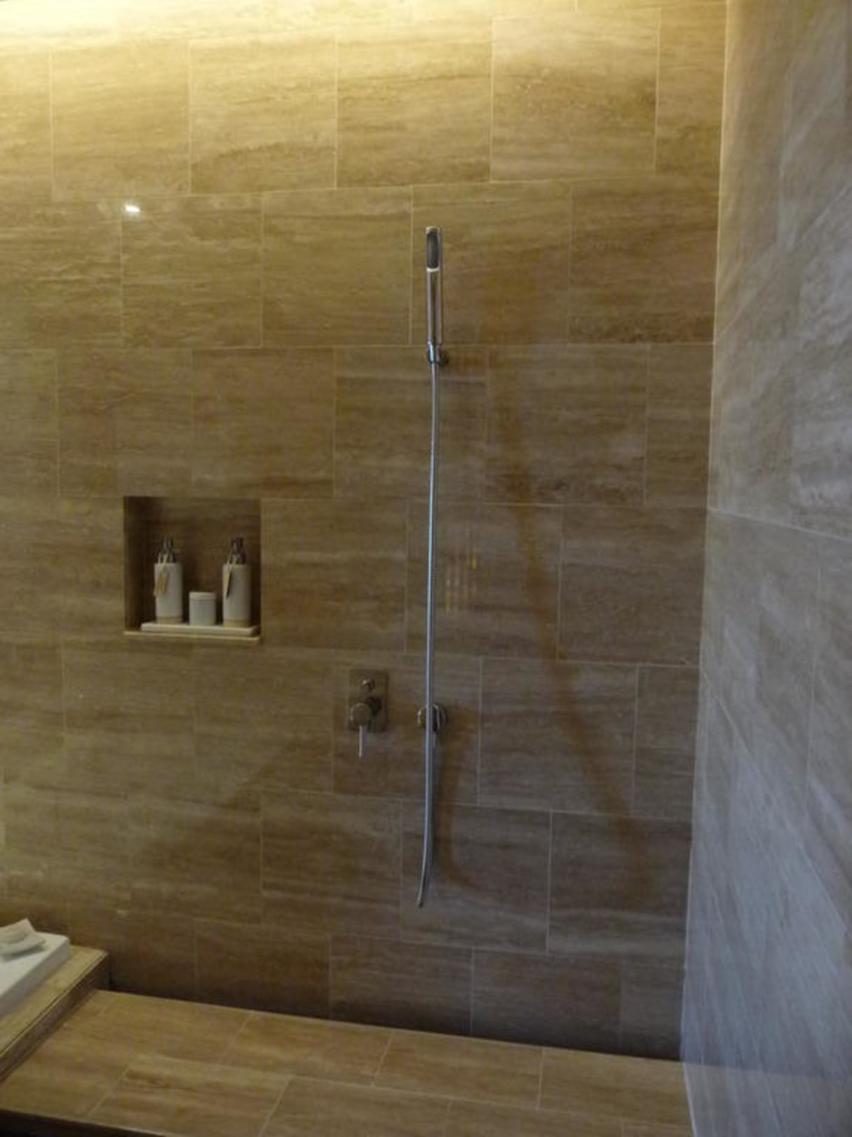 Ein mit Natursteinen gekachelter Baderaum bot genügend Platz für Zwei. Links (nicht im Bild) eine Whirlpool-Wanne mit 'Durchblick' zum Schlafzimmer.