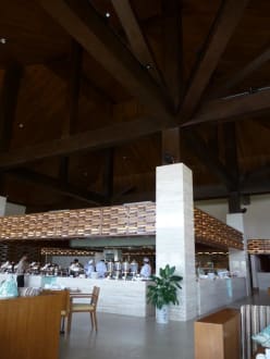 In der Mitte des Restaurants ein Karree, wo u.a. warme Speisen, eine 'Eierstation', Brot-Theke, Frischobst u.a. aufgebaut wurde - zusätzlich zu den anderen Sachen, die an der Wand aufgebaut waren.