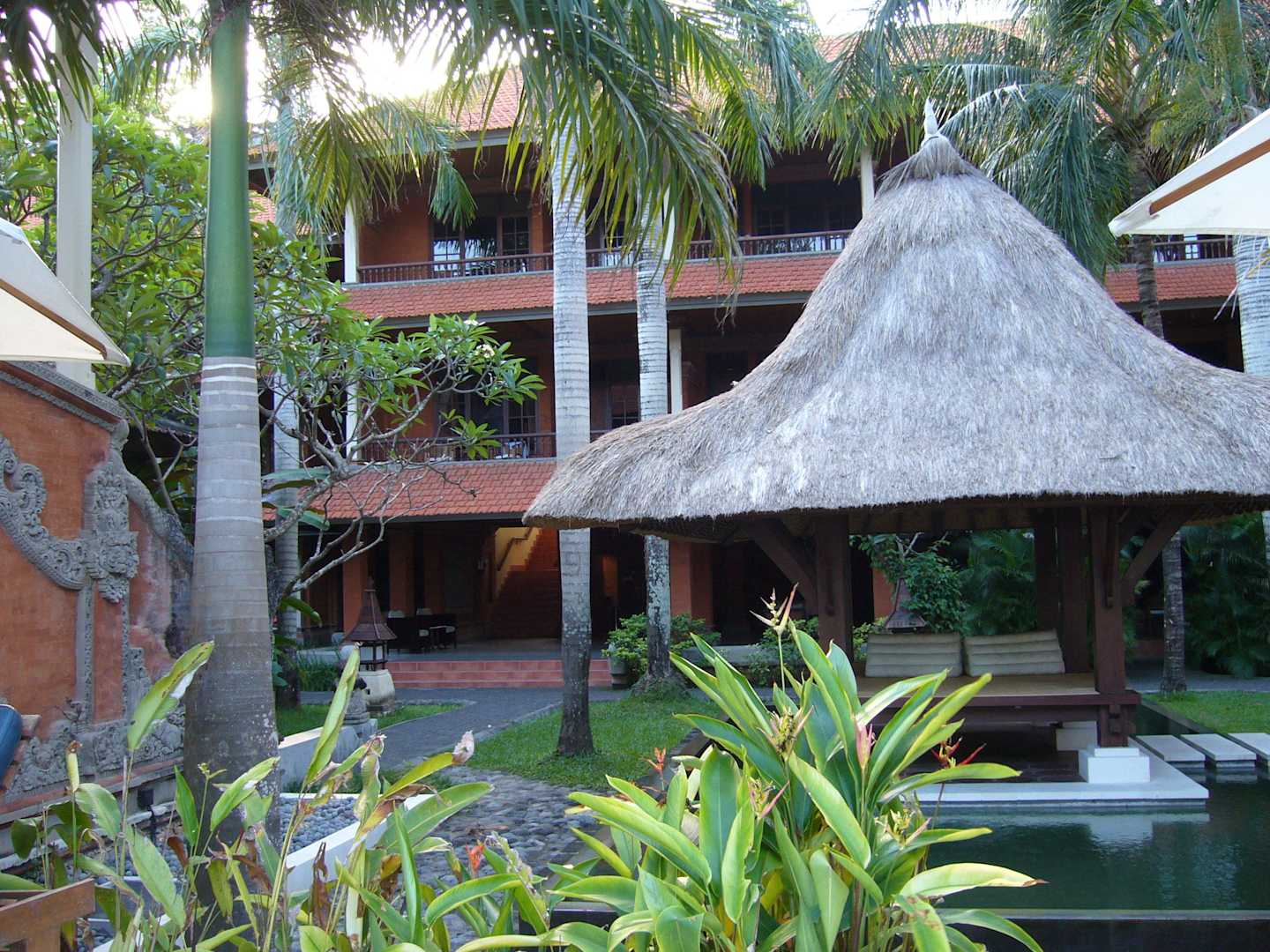 Blick vom Pool auf Gebäudeteil