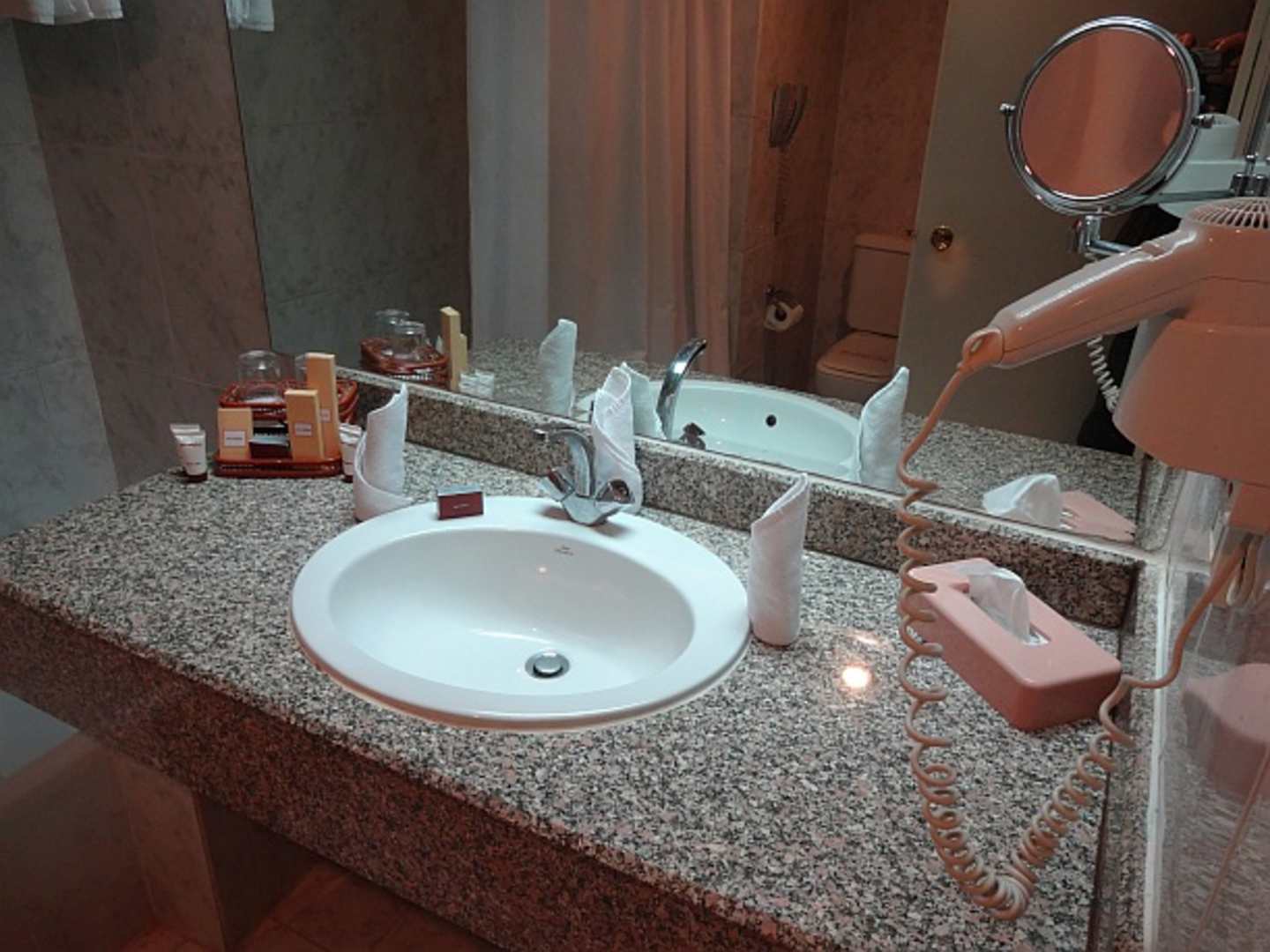 Das Bad mit Spiegeln, Fön und diversen Hygieneartikeln.
