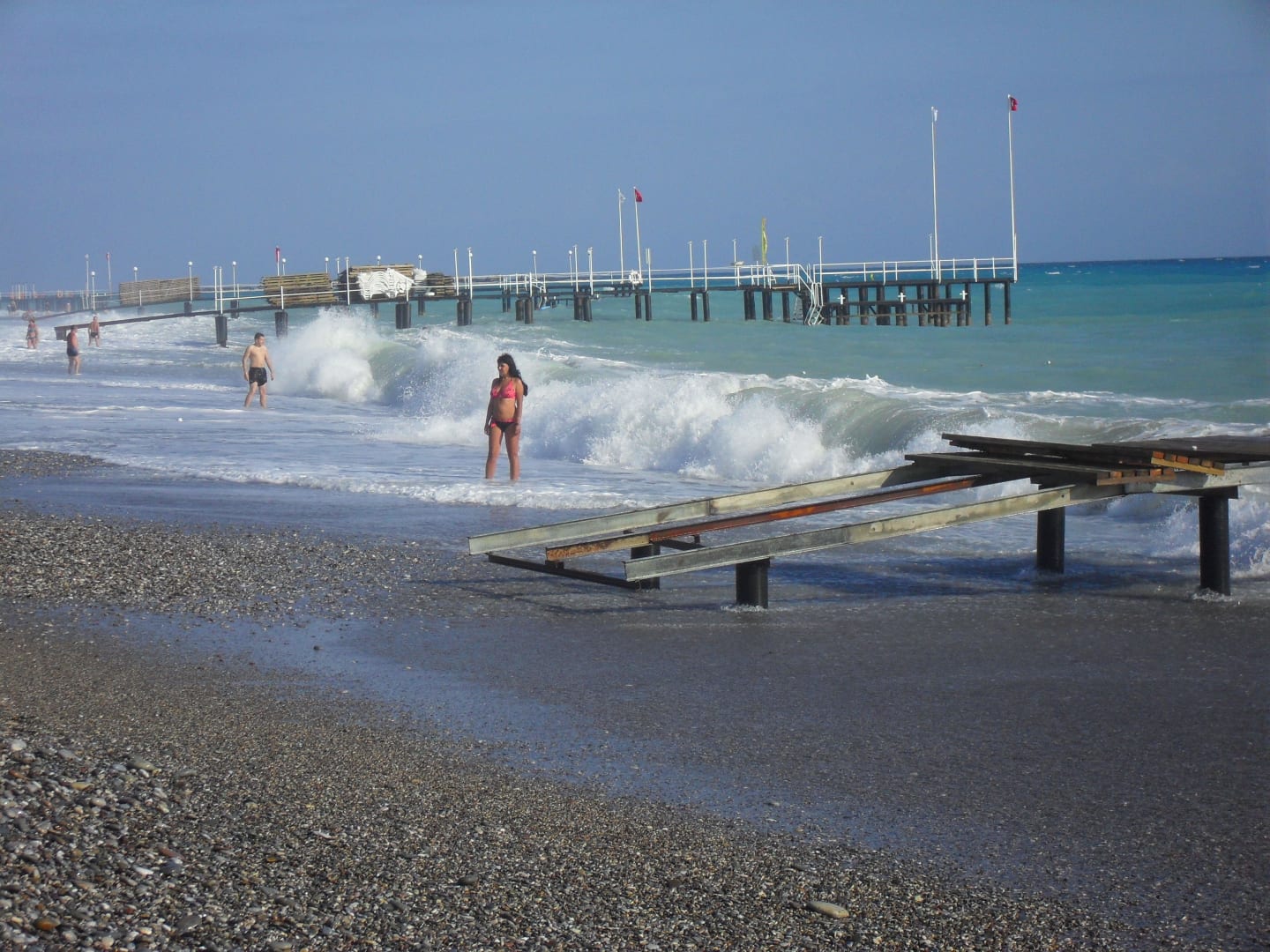 Noch ein Blick vom Strand auf den Anfang des Hotelstegs, der erst zwei Tage später geöffnet werden konnte. An dem Tag war reger Wind und eine schöne Brandung. Man sieht auch den Kiesstrand.