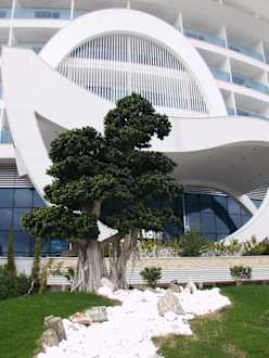 Eingangsportal mit dekorativen Miniaturbäumen