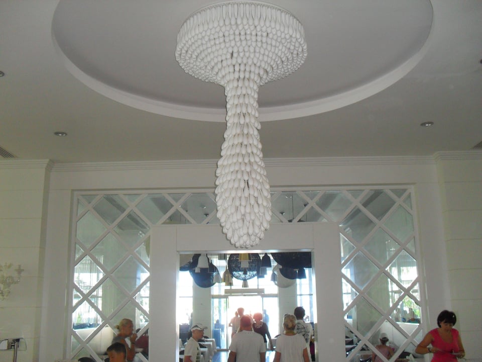 Eindrucksvoll gestalteter Leuchter im Buffetraum des Hauptrestaurants. Weiter hinten sind die Tische des Innebereiches zu sehen.