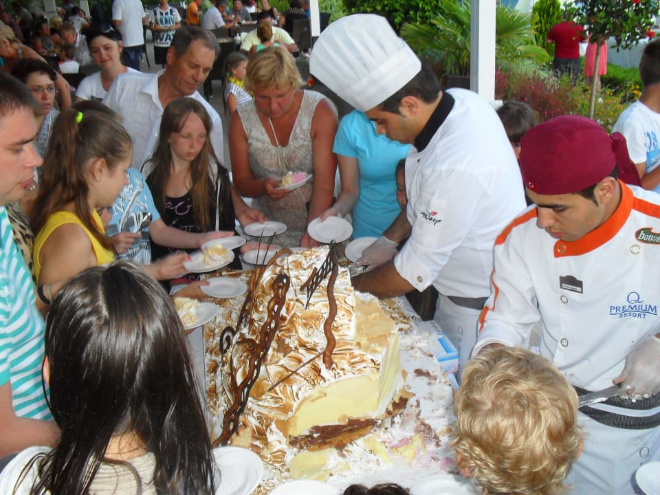 Tolle Idee des Restaurants. Es gab eine riesige Eistorte, die mit lautem Klatschen und Feuerwerk auf die Terrasse getragen und dort von den Mitarbeitern an die Gäste verteilt wurde.
