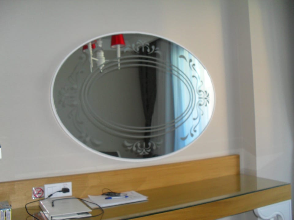 Spiegel und SchreibtischToller grosser Spiegel über dem Schreibtisch im Zimmer. Auf Knopdruck wird er indirekt beleuchtet.