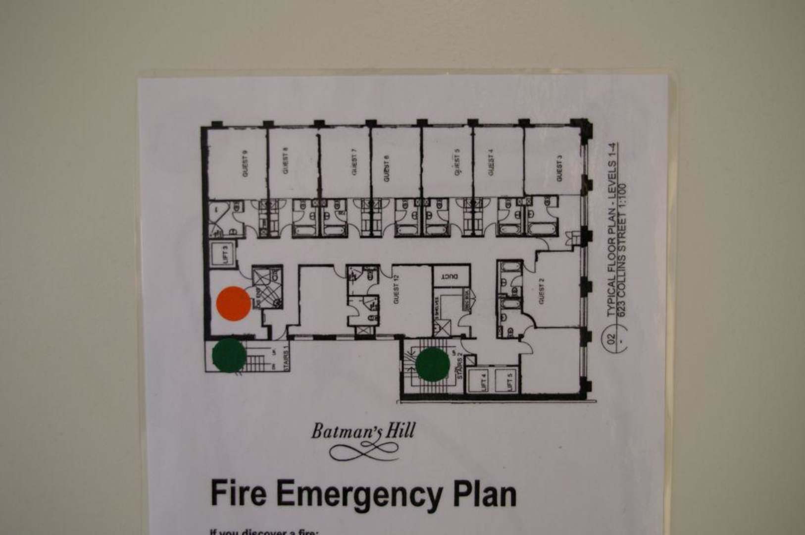 Schemagrundriss mit der Lage des Zimmers 1110 im Hotel, gleich neben einem Aufzug
