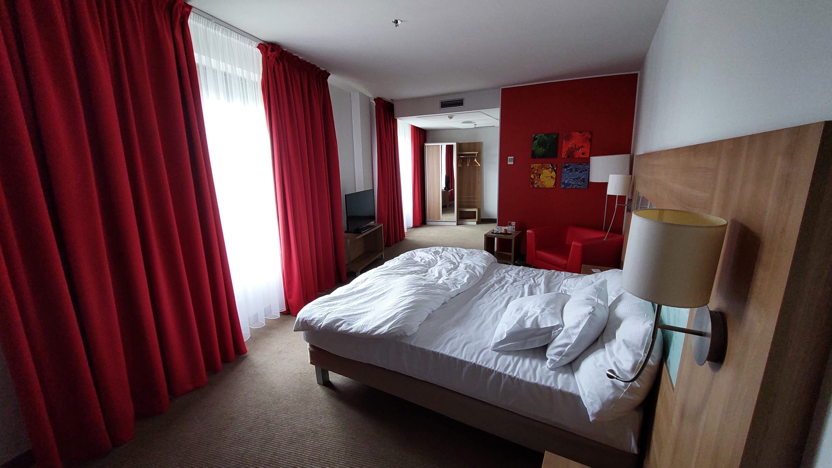 ZimmerSuperior-Zimmer: Bett, Sessel, Fernseher und im Hintergrund der Kleiderschrank, in dem auch Bügeleisen und Bügelbrett sind, sowie Bademäntel