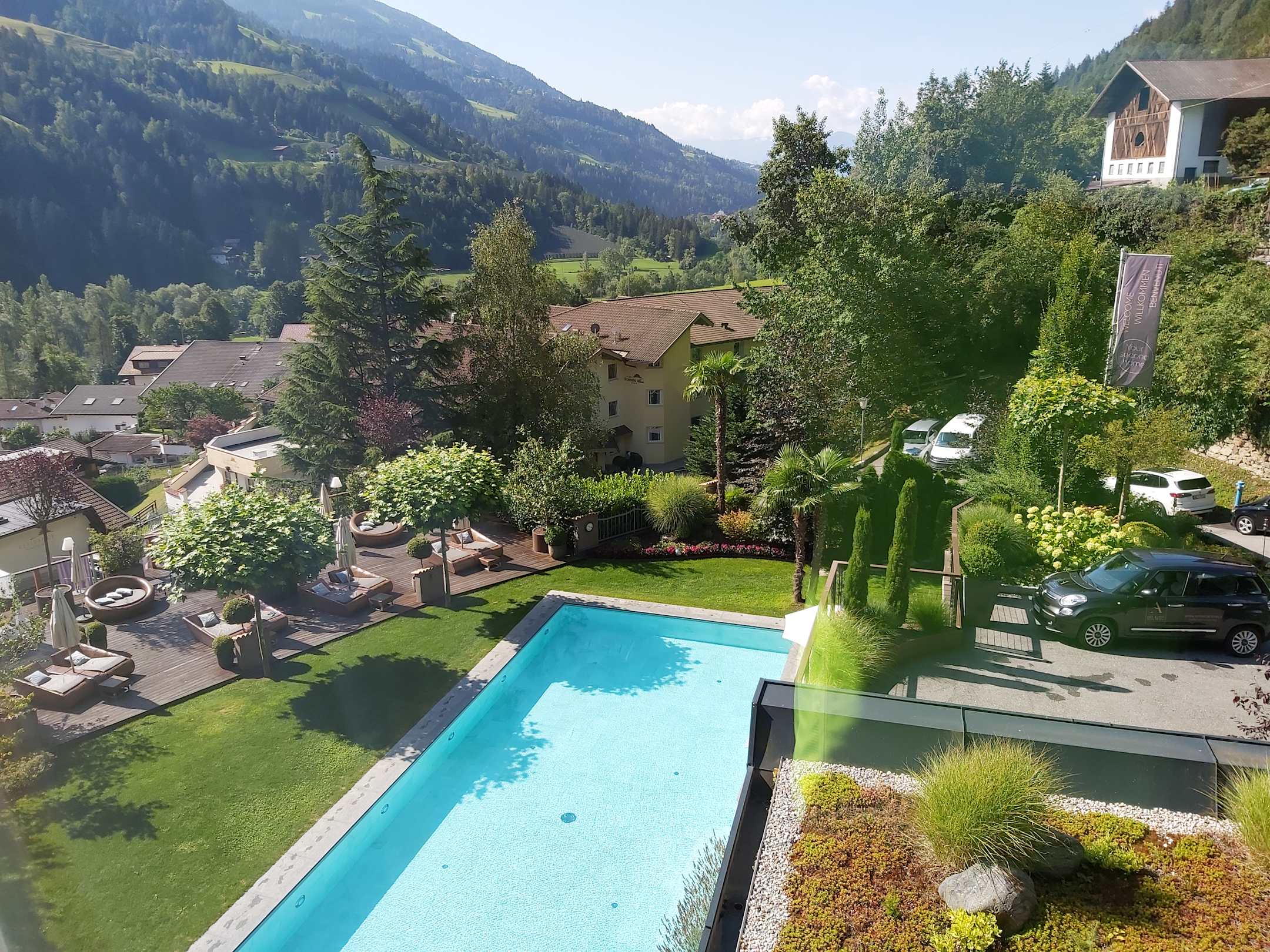 ZimmerWunderschöne Aussicht vom Balkon, in einen Teil der traumhaften Aussenanlage des Hotels und ins Grüne