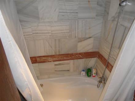 Badezimmer mit EckbadewanneLinks davon befindet sich die Toilette die sich allerdings nur erreichen lässt, wenn man zuvor die Türe geschlossen hat.