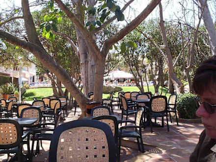 auf der Hotelterrasse bieten Bäume bei heißem sonnigen Wetter einen angenehmen Schatten; dort sind bei schönem Wetter auch die Tische eingedeckt und man kann draußen essen
