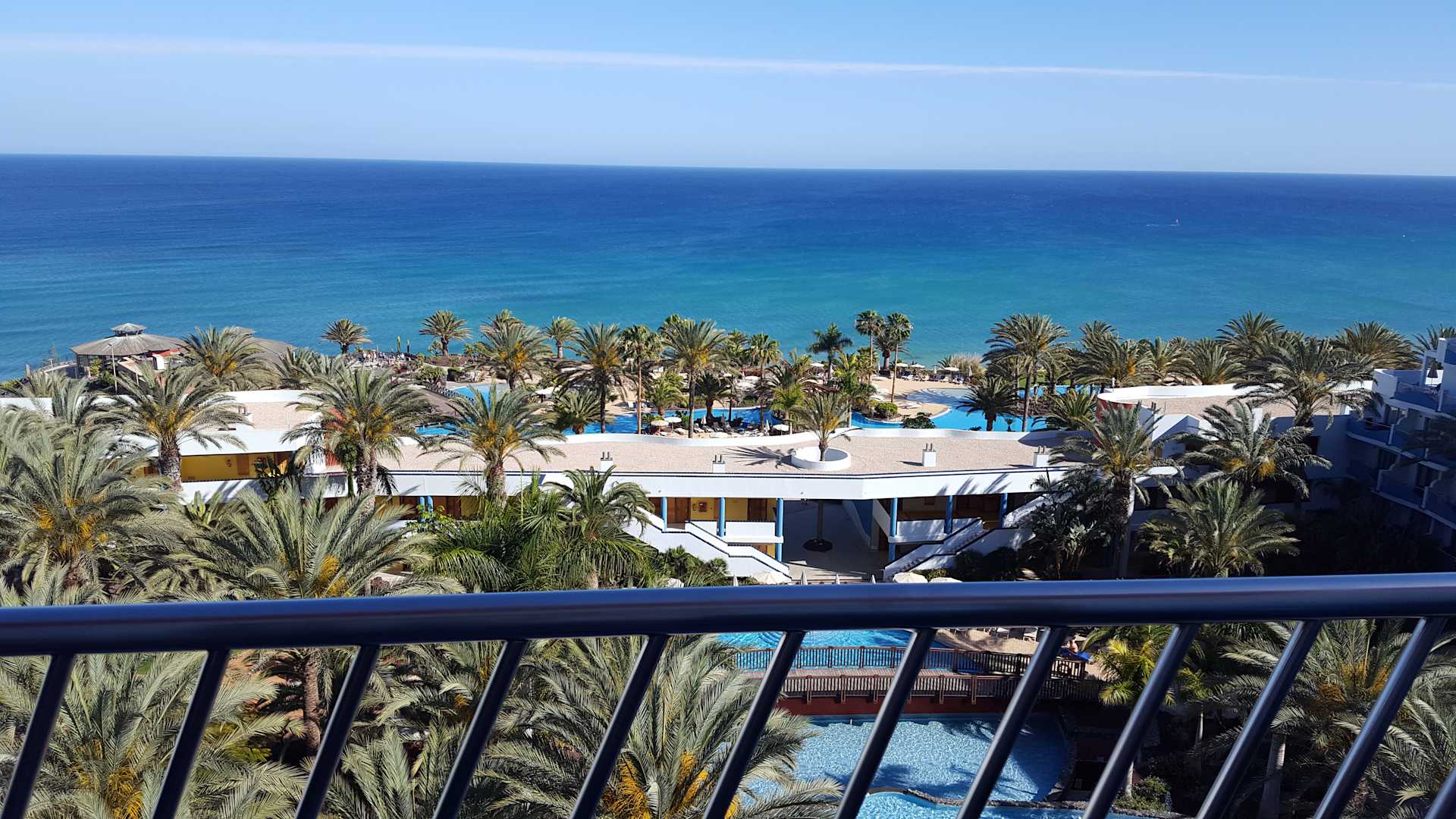 Ausblick vom Balkon auf die Garten- und Poolanlage mit Meer im Hintergrund