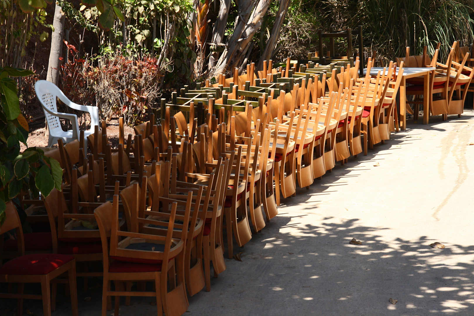 Mitten an der Poolanlage werden Stühle gelagert