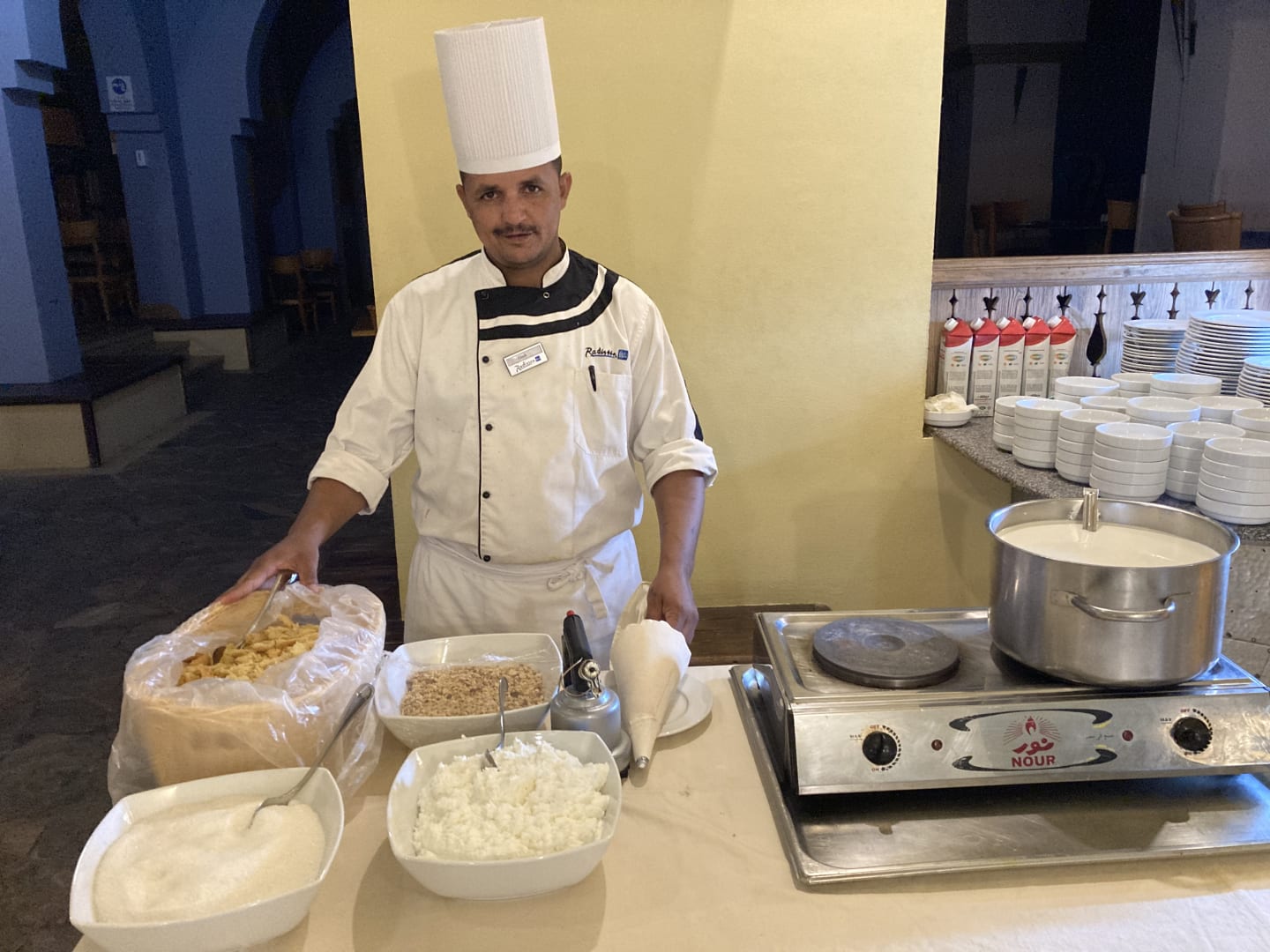 SonstigesOm Ali, typisch ägyptische Nachspeise frisch zubereitet. Absolute Empfehlung! Tipp: lasst Euch Rosinen und Kokosraspel reinmischen (einfach fragen).