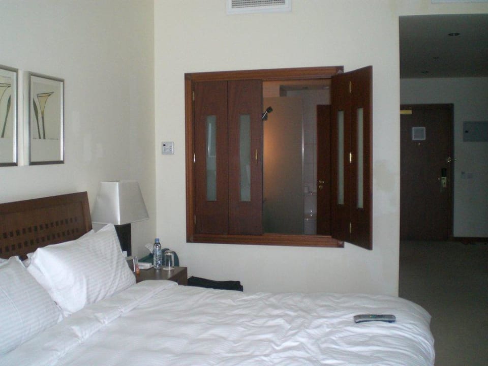 Direkter Blick vom Bett durch das Fenster ins Badezimmer. (Dusche)