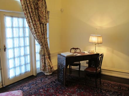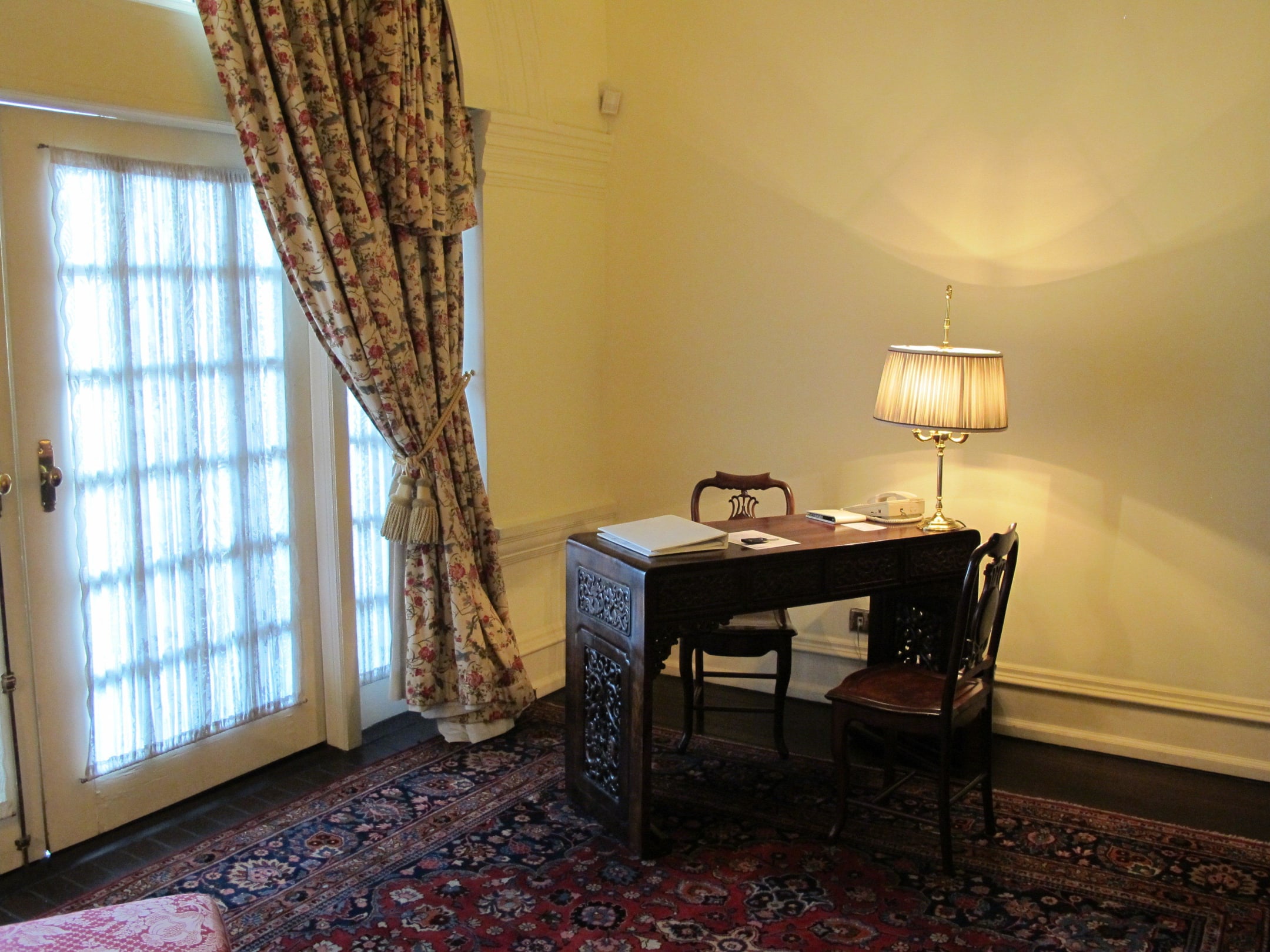 Die Türe führt auf die Veranda, die im Zimmer 250 wirklich absolut privat ist (mit der Ausnahme, dass die Veranda nur mit einem Paravent von der Cathay-Suite getrennt ist aber ohne Durchgangsverkehr von andern Hotelgästen).