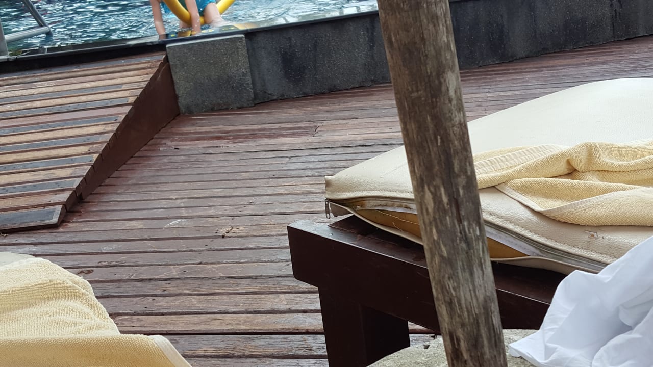 PoolVerschlissene und verschimmelte Auflagen auf den Sonnenliegen am Pool