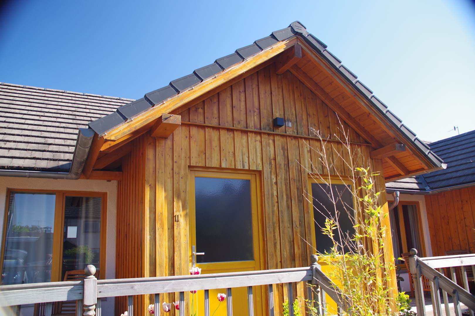Im Hof befinden sich Holzkabinen mit weiteren Zimmern