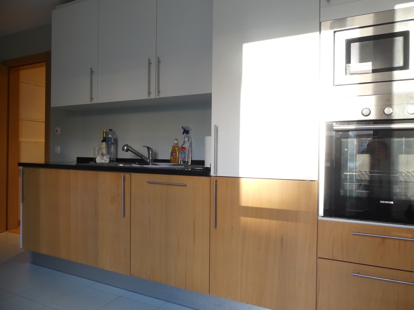 Küche mit Spüle und Kühlschrank und Spülmaschine