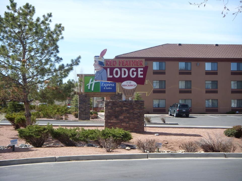 Werbeschild Red Feather Lodge. Im Hintergrund ist das Holiday Inn