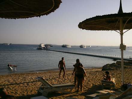 Strandblick auf den Steg der hinter das Riff führt