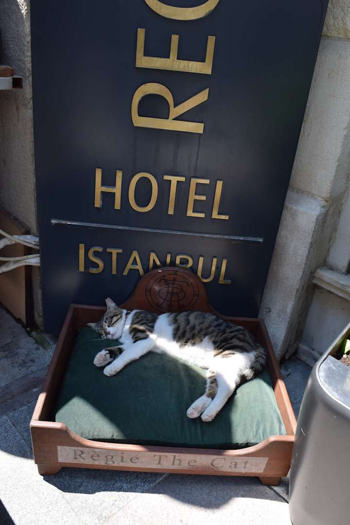 Die Hotel-Katze mit eigenem Bett vor dem Eingang