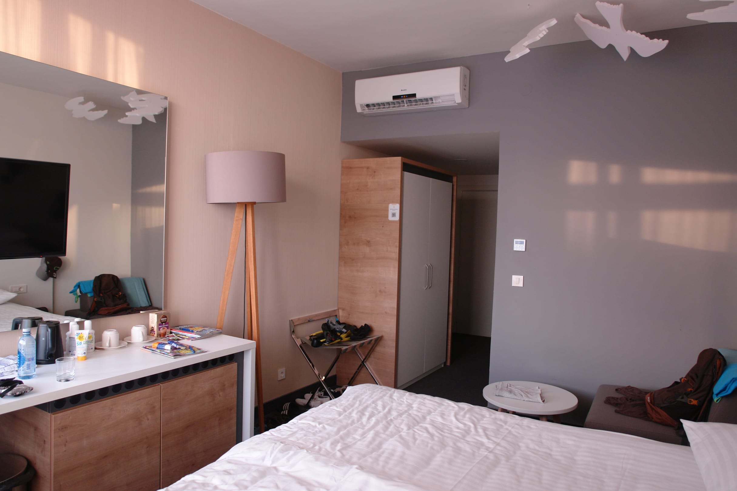 ZimmerZimmer mit großen Spiegel, TV, Schrank, Wasserkocher, Kleinen Kühlschrank, Klimaanlage